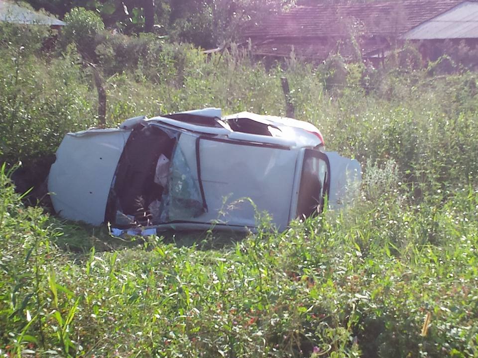 Com o impacto, o Sandero saiu da pista e capotou na margem esquerda da rodovia.