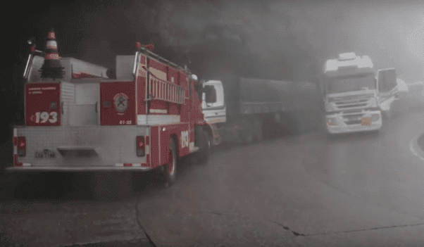 Enquanto isso, uma carreta que descia a serra acabou colidindo contra um caminhão do Corpo de Bombeiros Voluntários de Joinville, que estava estacionado enquanto a equipe de bombeiros prestava assistência no acidente entre a moto e o caminhão.