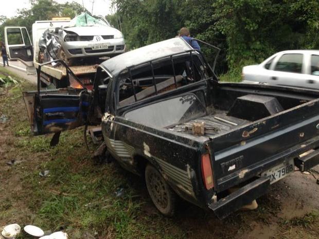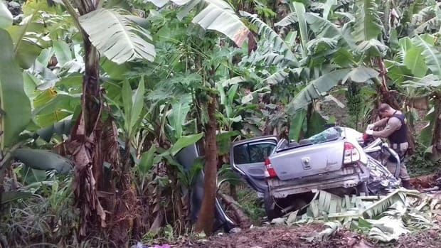 Com o impacto da batida os veículos foram arremessados para o acostamento e parte das ferragens pararam em meio a uma plantação de bananas.