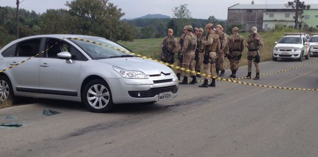 | Troca de tiros entre assaltantes e PM de Canoinhas e Major Vieira, após tentativa frustrada de assalto a agência bancária de Caçador/SC, em 15/05/2017. Arquivo |