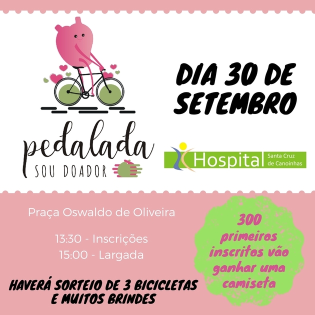 Quem tiver interesse de participar da Pedalada SOU DOADOR do Hospital Santa Cruz, é só comparecer no próximo dia 30 de setembro na Praça Oswaldo de Oliveira a partir das 13:30 para realizar sua inscrição e a partir das 15 horas acontece a largada.