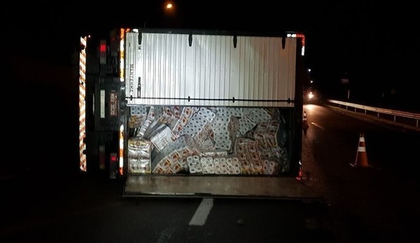 | A carga, de fardos com papel higiênico, foi parcialmente saqueada/Divulgação |