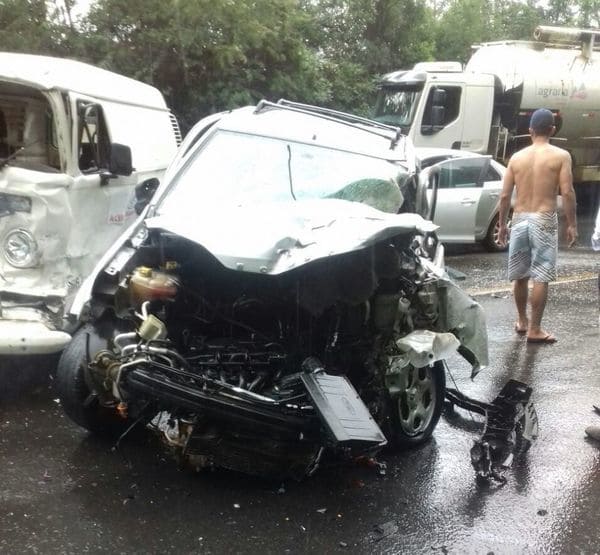 Segundo a PRF, a Ford/Ecosport perdeu o controle em uma curva à direita e colidiu lateralmente em um caminhão que seguia no sentido contrário. Dois automóveis que seguiam na retaguarda do caminhão colidiram em seguida.