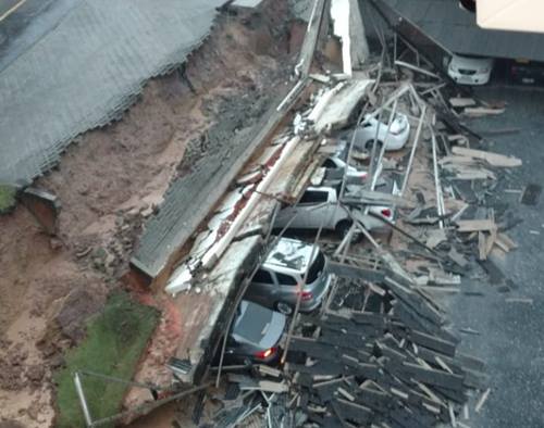 | Muro desabou em cima de sete veículos em Blumenau/Divulgação |