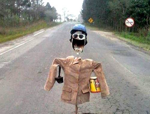 Confeccionado em diversos materiais, um boneco foi colocado em um dos inúmeros buracos existentes ao longo da rodovia.