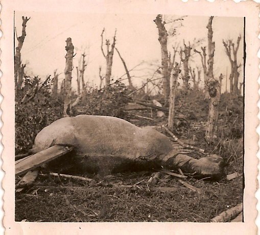 Muitas dessas madeiras acabaram matando animais e pessoas. A foto de um cavalo com uma tábua atravessada em seu corpo demonstra a violência do vento.