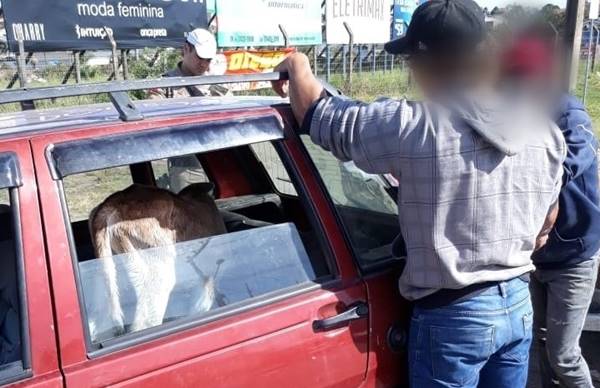 | O terneiro estava no banco traseiro do veículo, que circulava pelo centro da cidade. Foto: PM/Divulgação |