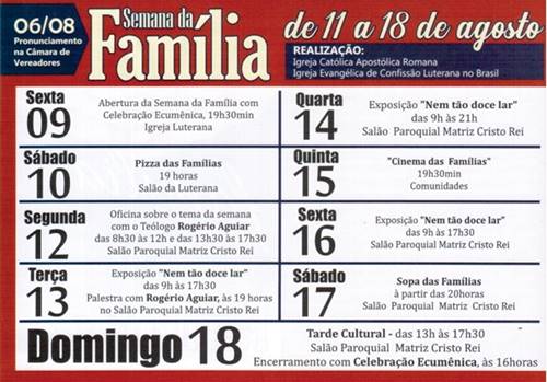 A Semana da Família é realizado pela Católica Apostólica Romana, Igreja Evangélica de Confissão Luterana no Brasil, Igreja Batista Nacional Plenitude e Igreja Assembleia de Deus.