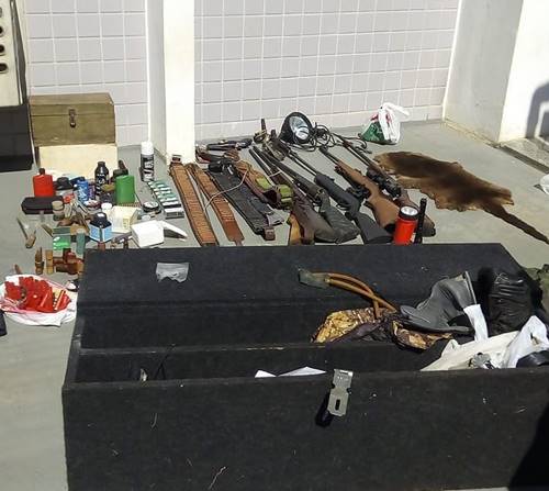 Ato contínuo, as demais guarnições deslocaram até a residência, onde foram localizados: seis espingardas de diversos calibres, um revólver Rossi calibre calibre .22 com capacidade para 7 tiros, uma garrucha calibre .22, diversas munições de variados calibres, uma luneta, 4 cintas porta cartucho, insumos para a confecção de cartuchos, duas armadilhas com percussão de cartuchos utilizadas em atividades de caça, assim como variados materiais utilizados na caça a animais silvestres.