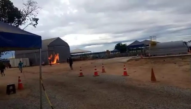 | Moradores expulsaram os trabalhadores e na sequência atearam fogo ao galpão de lona onde os trabalhadores fariam a quarentena. Foto: Reprodução |