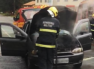 Os Bombeiros foram acionados às 14h15, e encontram o veículo na Rua Álvaro Soares Machado, nas proximidades da Sicoob, parcialmente tomado pelas chamas.