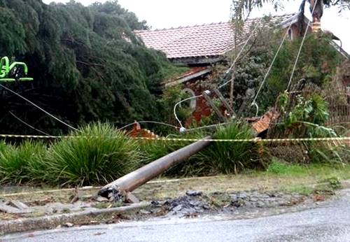 | Poste foi arrancado e destruiu muro de residência no Alto das Palmeiras. Foto: Canoinhas Online |