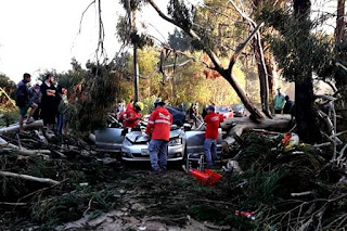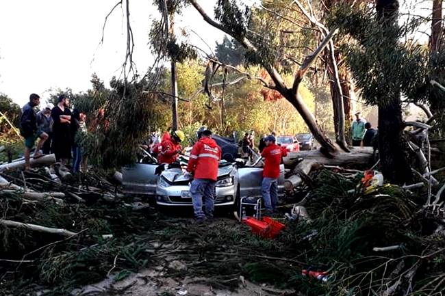 A queda de um eucalipto aconteceu durante o vento forte causado pela passagem de um ciclone pelo Estado. Miraci Fernandes estava no banco traseiro do veículo e ficou presa às ferragens.