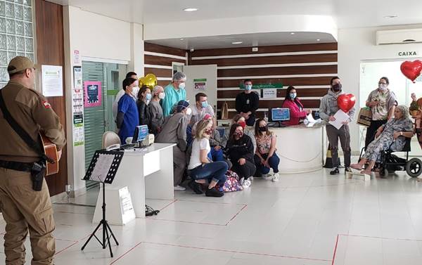 O homem estava intubado há 15 dias e hoje funcionários do hospital comemoraram, juntamente com os policiais militares, que fizeram uma apresentação musical pela sua recuperação.