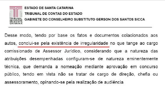 Em decisão singular, o Conselheiro do Tribunal de Contas de Santa Catarina, Gerson dos Santos Sicca, após a Diretoria de Atos de Pessoal (DAP) proceder a análise do mérito da denúncia, concluiu pela configuração da irregularidade apontada pelo denunciante em relação aos cargos comissionados de Assessor Jurídico nos seguintes termos: