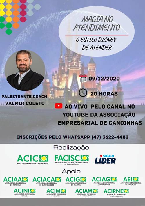 Nesta quarta-feira (9), a Associação Empresarial de Canoinhas – ACIC – realizará a palestra Magia no Atendimento: o estilo Disney de atender, em parceria com a empresa Coleto Soluções Administrativas, Federação das Associações Empresariais de Santa Catarina – FACISC e demais associações da regional Norte e Planalto Norte.
