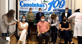 O médico responsável pela Ala Covid do Hospital Santa Cruz, Dr. Nizomar Filho Costa de Souza, a enfermeira Regiane Polakoski, e a técnica de enfermagem Elizete Ribeiro foram os primeiros a receberem a vacina contra Covid-19 em Canoinhas.