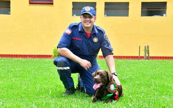 Soldado David Canever e cadela Léia, de Porto União, pertencente ao 9º Batalhão de Bombeiros Militar, com sede em Canoinhas;