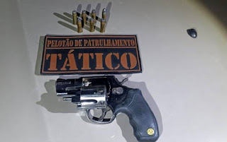 Ao realizar busca veicular, foi localizado, no porta luvas do veículo um revólver calibre 38, marca Taurus, com 7 munições intactas. Indagado sobre a origem da arma, a mulher relatou que era de seu marido.