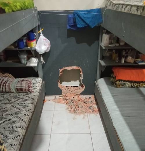 | Internos usaram um eixo de ventilador para quebrar e fazer um buraco da parede do alojamento. Foto: Divulgação |