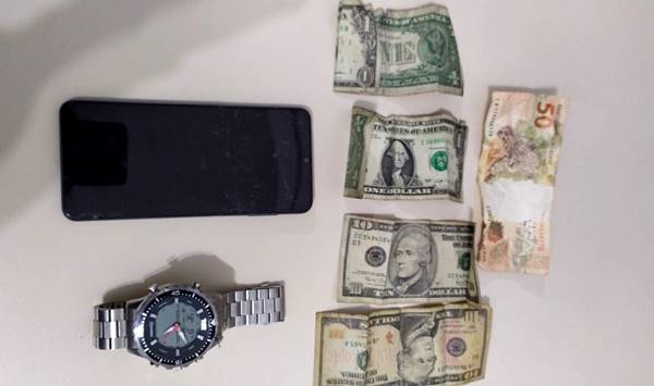 Na madrugada desta terça-feira (16), policiais militares apreenderam um relógio de pulso, um aparelho celular, dólares e reais, bem como efetuaram a prisão de dois homens suspeitos de roubo.
