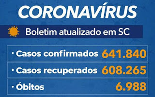 Há, em Santa Catarina, 641.840 casos confirmados de infecção pelo novo coronavírus, sendo que 608.265 se recuperaram e 26.587 estão em acompanhamento. O número foi divulgado nesta segunda-feira, 22.