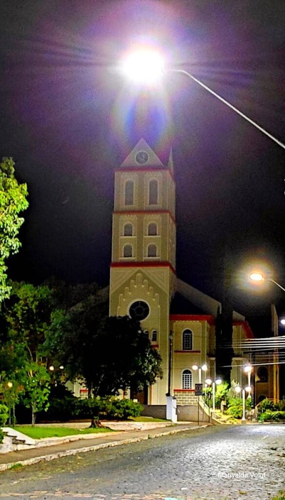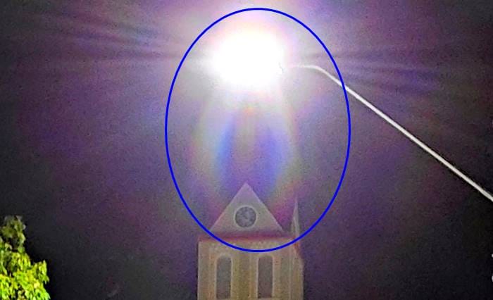 Ao fotografar a igreja Matriz Cristo Rei em Canoinhas, um reflexo da luz de um poste de iluminação pública formou, no alto da igreja, um contorno muito semelhante a Nossa Senhora.