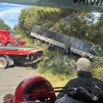 No local foi encontrado um caminhão Mercedes benz/Axor, placa de União da Vitória (PR) e carreta carregada com toras de madeira, tombado na lateral da via.