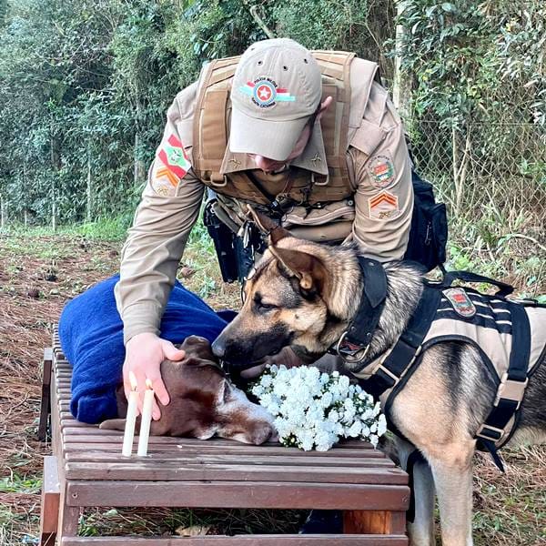 A imagem é triste, forte e emocionante. Prestando continência, o PM Fabio Durau, responsável pelo canil do 3º BPM de Canoinhas, se despediu do cão Rock, que por 9 anos se dedicou ao serviço policial militar e morreu no último sábado (21).