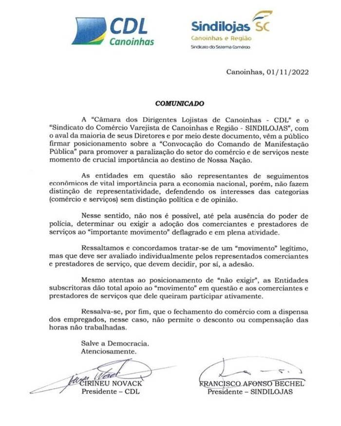 Segundo o comunicado, as entidades concordam que as manifestações que estão sendo feitas — como o bloqueio parcial do acesso pela BR-280, em Canoinhas — “é um movimento legítimo” e que deve ser avaliado individualmente pelos comerciantes e prestadores de serviços, que devem decidir se aderem ou não, já que não podem exigir dos mesmo a adesão “a este importante movimento”.