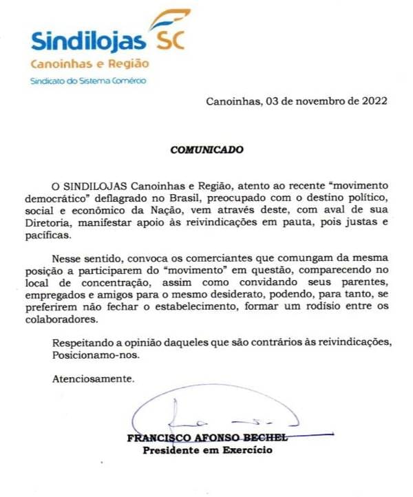 Assinado pelo presidente da entidade Francisco Afonso Bechel, o texto convoca os comerciantes a participarem do movimento, comparecendo no local de concentração.