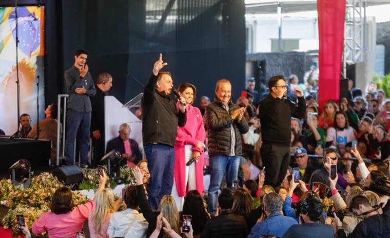O casal participou do encontro do PL Mulher em Florianópolis neste sábado (29), evento que busca incentivar mulheres e jovens do partido à participação política. Bolsonaro chegou acompanhado do governador Jorginho Mello ao final do evento, por volta do meio-dia. Na passagem, falou sobre a polêmica do Pix.