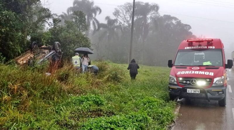 Um veículo Renault Sandero, com três ocupantes, saiu da pista na tarde desta quinta-feira (27), na SC-418, na localidade conhecida como Rio do Julio em Joinville. Isso fez com que o carro capotasse e fosse parar com as rodas para cima, às margens da rodovia.