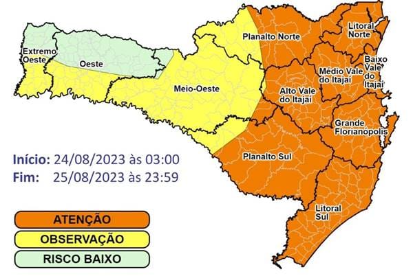 Nas regiões em laranja (mapa acima), o risco é alto para ocorrências associadas a destelhamentos, danos a rede elétrica, queda de árvores e alagamentos pontuais, moderado nas áreas em amarelo e baixo nas áreas em verde.