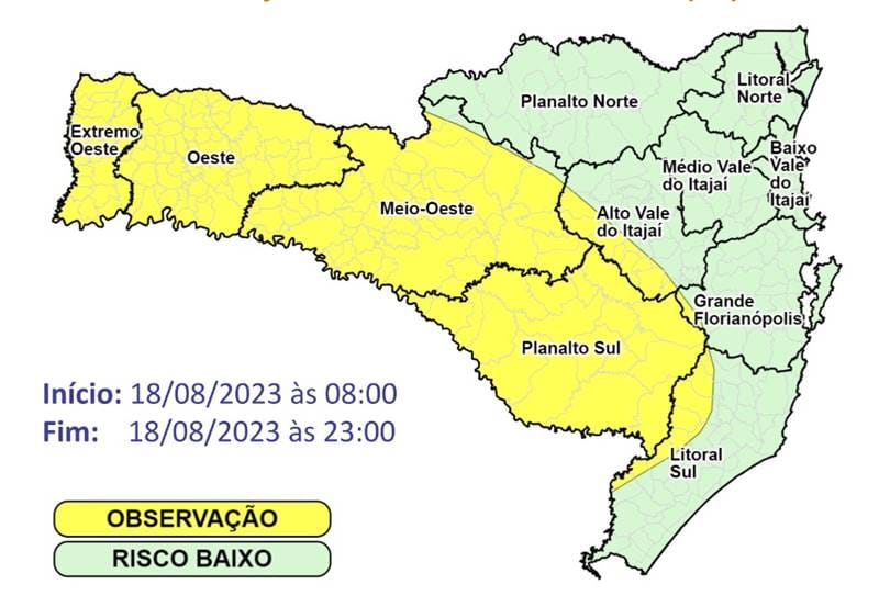 “A frente fria avança primeiro pelas regiões: Oeste, Meio-Oeste, Planalto Sul e Litoral Sul, provocando pancadas de chuvas com trovoadas no período da tarde. Já no final do dia e começo da noite pega a região da Grande Florianópolis, Vale do Itajaí e o Norte, provocando a mesma condição. Além de raios a previsão indica ventanias que podem passar dos 60 km/h e as temperaturas acabam diminuindo. No sábado a tendência é de melhora no tempo”, informou o meteorologista Marcelo Martins.