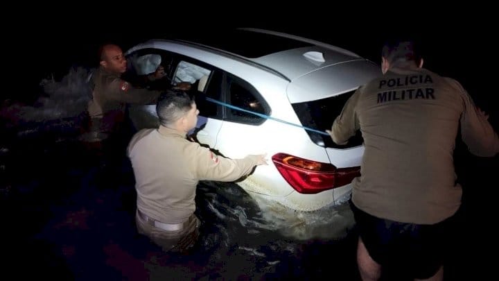 Em sequência os militares foram em direção ao veículo que estava quase submerso e estava sendo levado pela força da maré. De longe era possível escutar os gritos de socorro do condutor que não conseguiu sair do veículo devido a pressão da água.