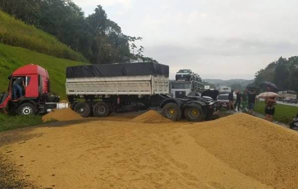A PRF informou que o caminhão, carregado com soja, não conseguiu parar e arrastou sete carros. Um dos veículos atingidos foi parar na pista sentido Curitiba, que ficou totalmente bloqueada.