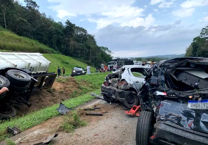 De acordo com a Polícia Rodoviária Federal (PRF), um caminhão bitrem freou na pista porque o trânsito da rodovia havia parado por motivos desconhecidos. Com isso, o veículo foi atingido na traseira por outro caminhão. Em seguida, uma caminhonete não conseguiu parar e se envolveu no acidente.