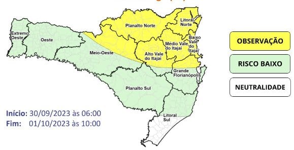 A Defesa Civil de Santa Catarina emitiu um aviso meteorológico para chuva persistente e temporais isolados entre o sábado (30) e a manhã de domingo (1º de outubro).