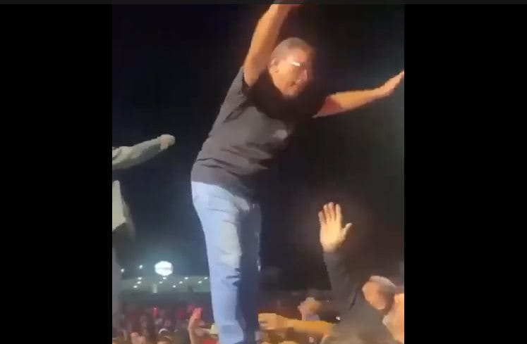 No vídeo, é possível ver que o gestor público dança e sinaliza a intenção de se jogar. As pessoas que festejavam ao redor do palco, no entanto, não o seguraram e ele foi de encontro ao chão.
