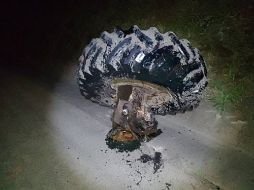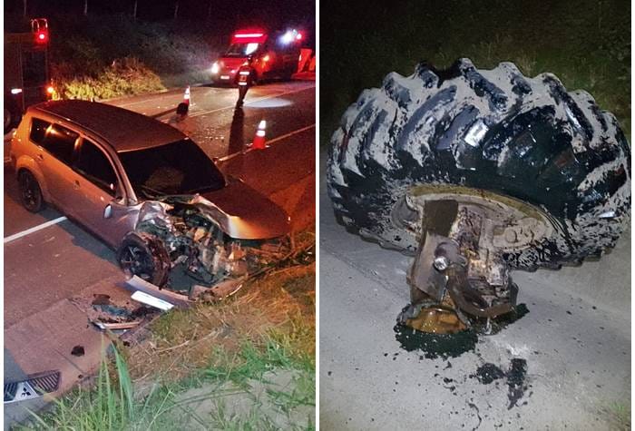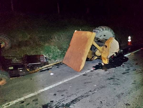 Com o impacto da colisão, o trator partiu-se em três partes, ficando elas espalhadas pela via. Veja nas fotos abaixo.