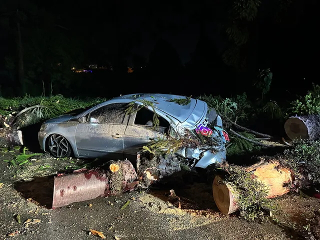 Um carro ficou destruído após ser atingido e esmagado por uma árvore que caiu durante os ventos fortes registrados no fim da noite de terça-feira (26). O caso aconteceu em Campos Novos, no Oeste de Santa Catarina, onde os ventos chegaram a 83 km/h.