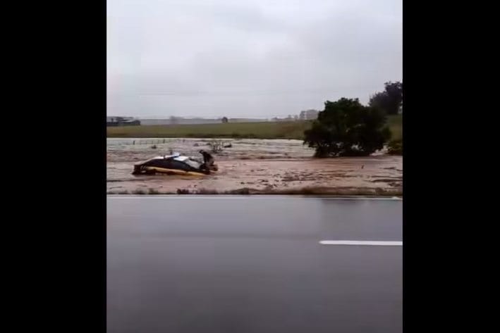Uma viatura da Polícia Rodoviária Federal (PRF) foi arrastada pela água que cobre a pista da BR-116, na altura do km 386, em Camaquã, na Região Sul do Rio Grande do Sul, durante a manhã desta quarta-feira (13).
