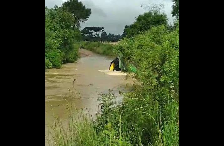 Pessoas que estavam próximas ao local gravaram o momento do acidente. Nas imagens, é possível ver o trator virar e ser arrastado pela força da enxurrada (assista no vídeo abaixo).