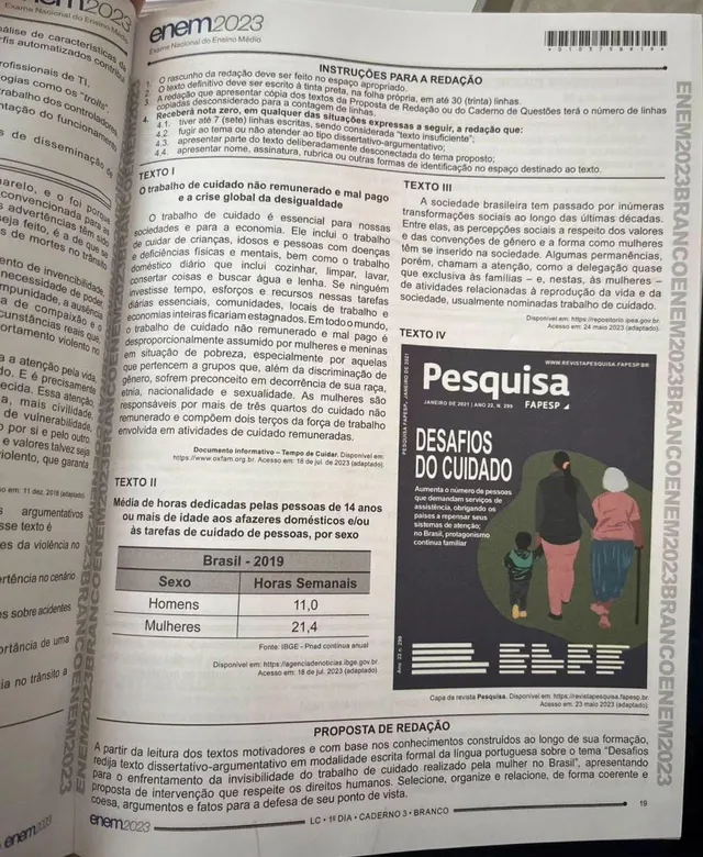 A foto que tem circulado na internet mostra a página onde consta o tema da redação do Enem 2023 “Desafios para o enfrentamento da invisibilidade do trabalho de cuidado realizado pela mulher no Brasil” e os textos de apoio.