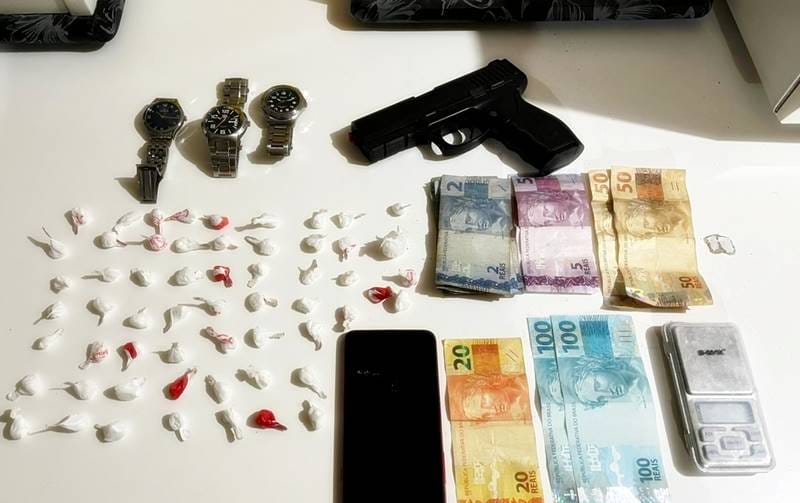 Diante do flagrante delito, o homem foi preso e os policiais seguiram para a residência do casal. No local, foram encontradas 56 porções de cocaína embaladas e prontas para venda, pesando aproximadamente 31 gramas. A equipe também apreendeu três aparelhos celulares, uma balança de precisão e um simulacro de arma de fogo.