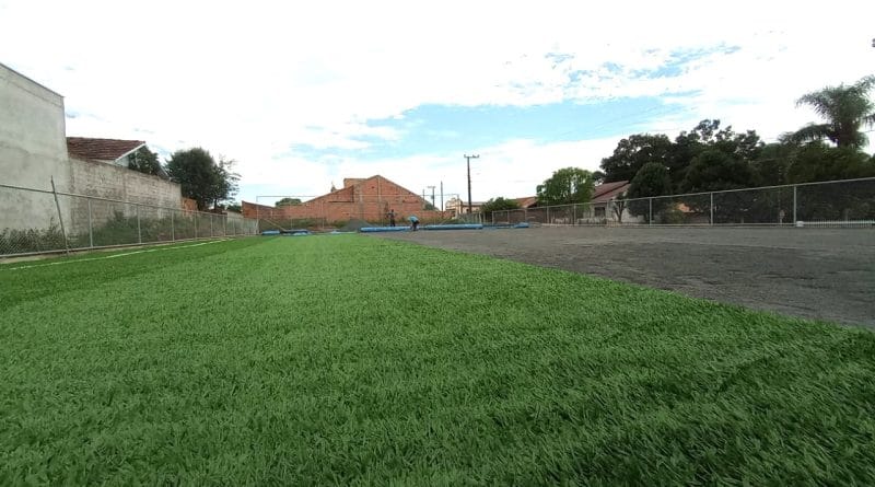 A quadra de futebol society do bairro Piedade está recebendo grama e, em Marcílio Dias, as obras estão na fase de terraplanagem.
