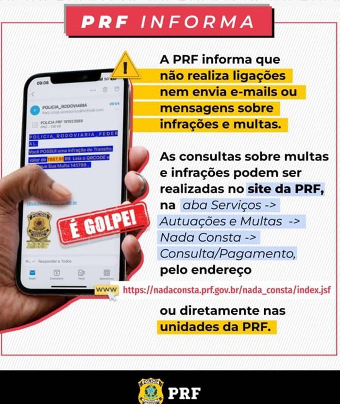 A Polícia Rodoviária Federal, responsável pela segurança e fiscalização dos mais de 70 mil quilômetros de rodovias federais brasileiras, identificou a circulação de e-mails informando a existência de falsas multas e direcionando o usuário para um QR Code.