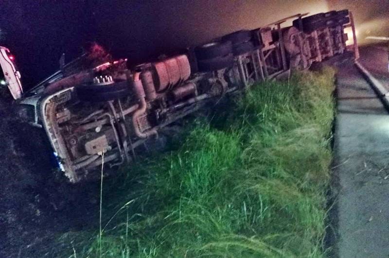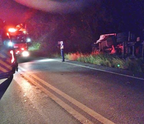 No local, os bombeiros depararam-se com uma carreta Volvo tombada. O condutor, um homem de 38 anos, estava deitado fora do veículo e apresentava escoriações na face, ferimento com hemorragia na região posterior do braço esquerdo e dores na articulação.