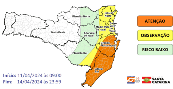 Nas áreas em laranja do mapa (veja abaixo) são esperados de 200 mm a 300 mm até o domingo (14), com pontuais que podem superar os 350 mm, sendo a sexta-feira e o sábado, os dias mais críticos, ou seja, os dias em que a chuva deve ser mais intensa e volumosa. Nessas áreas, Litoral Sul a Grande Florianópolis, o risco é alto a muito alto para ocorrências como alagamentos, deslizamentos, inundações e enxurradas.